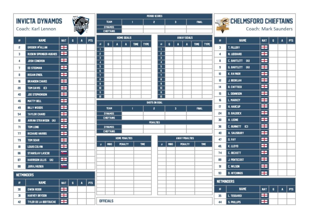 TEAM LIST – INVICTA DYNAMOS V CHELMSFORD CHIEFTAINS 08.10.22