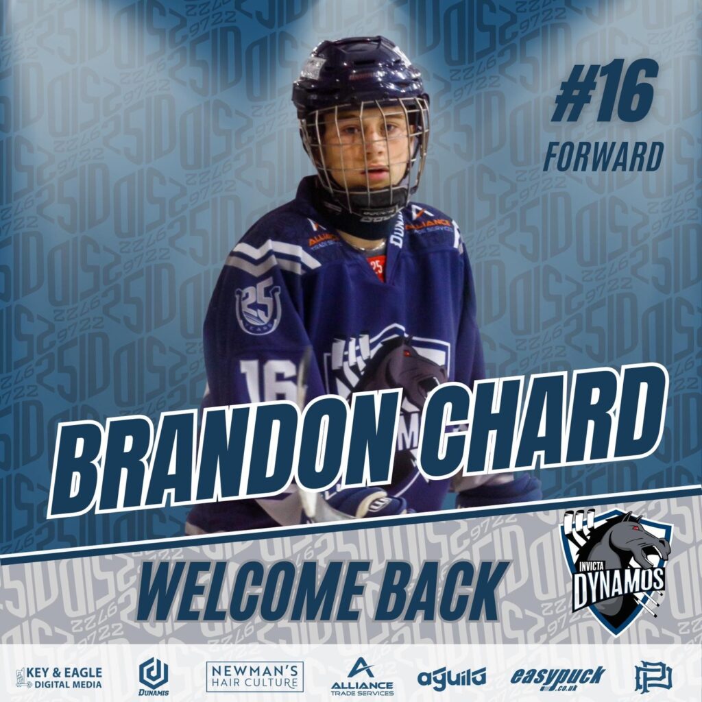 The Invicta Dynamos are pleased to announce that 16-year-old forward, Brandon Chard, will be icing for us once again come September and his return marks his second season with the Mos and our tenth signing of the 2023/24 season so far.  His addition to the team last year was a clear message of the pathway the club is moving forwards with, in terms of fostering and developing home grown talent, and Brandon did not let the responsibility and pressure that comes with senior hockey defy him, he certainly held his own on the ice.